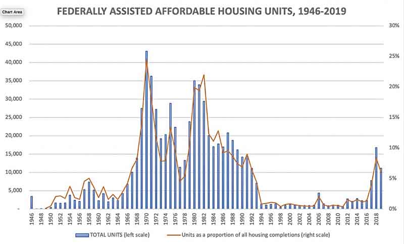 Spending on affordable housing has risen since the federal government announced a new National Housing Strategy in 2017, but housing experts say the funding and units promised need to be increased to make up for decades of under-investment. Chart by Brian Clifford, data from CMHC's Canadian Housing Statistics, multiple years.