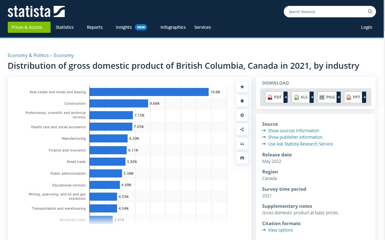 This chart is always published online at the same url and populated with data for the latest available year.The top blue bar shows that the Real estate, rental, and leasing (RERL) sector accounts for 19.6% of the dollars that changed hands in 2021. That number was the same in 2020. Construction, the next blue bar, is 9.6%, less than half of what British Columbians spent on rent in 2021.