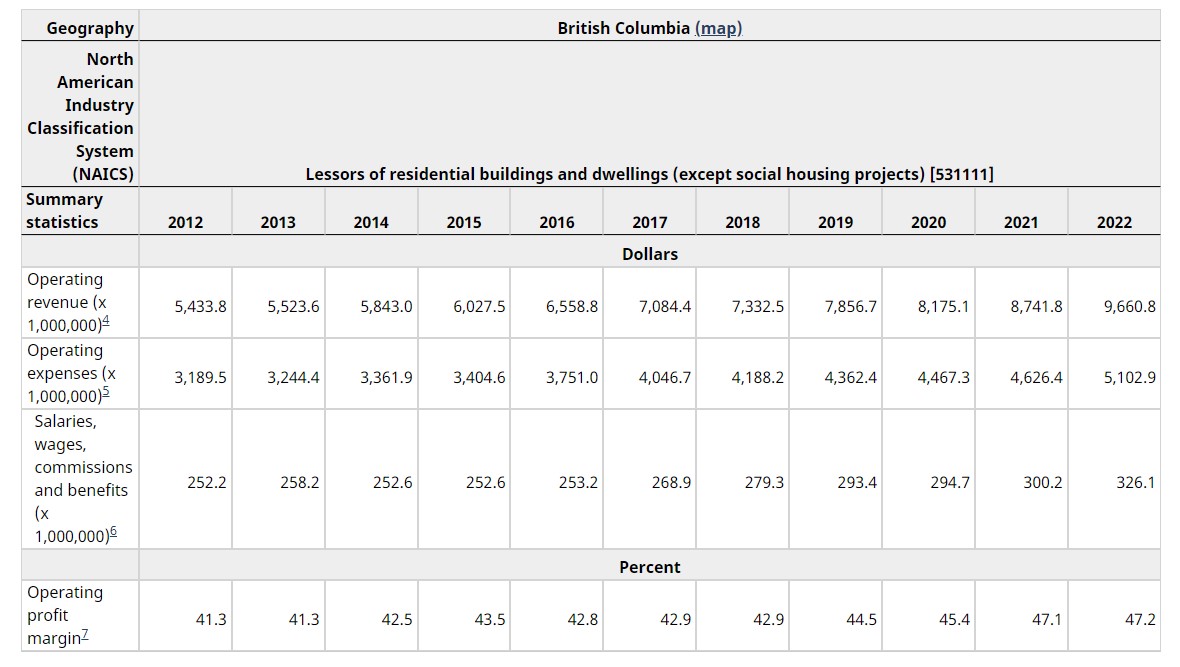 Chart #2, published online at the StatCan website, illustrates that in BC the gross operating profit; i.e., profit before taxes, for the RERL sector has increased steadily from 41.3% in 2012 ($2.2 billion) to 47.2% ($4.6 billion) in 2022 over the time span available for this particular data point:
